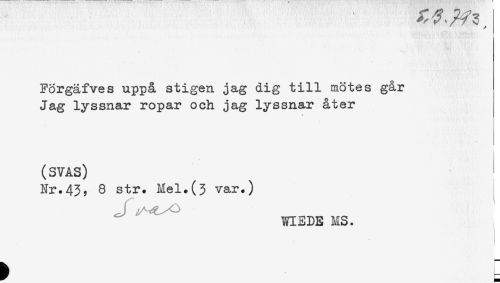 //// Förgäfves uppå stigen jag dig till mötes går //// Jag lyssnar ropar och jag lyssnar åter //// (SVAS) //// Nr.43, 8 str. Mel.(3 var.) ////