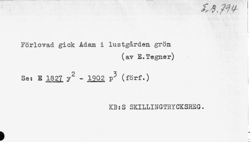 //// Förlovad gick Adam i lustgården grön //// (av E.Tegner) //// Se: E 182? y^ - 1902 p^ (förf.) //// < //// KB:S SKILLINGTRYCKSREG. //// ! ////