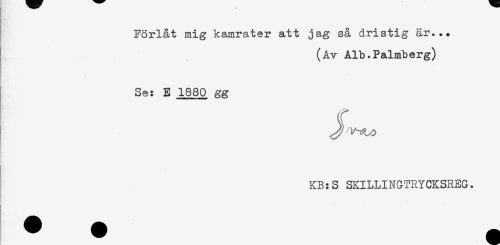 //// Förlåt mig kamrater att jag så dristig är... //// (Av Alb.Palmberg) //// Se: E 1880 gg //// KB:S SKILLINGTRYCKSREG. ////