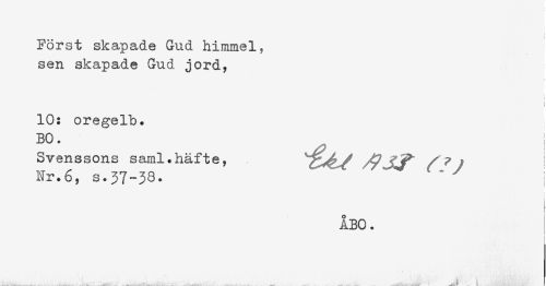 //// Först skapade Gud himmel, //// sen skapade Gud jord, //// ! //// 10: oregelb. //// BO. j //// Svenssons saml.häfte, /yTjL^ ! //// Nr.6, s.37-38. " ^ I //// ! //// } //// ÅBO. //// ... . . . . ___; ... ...... , _____ _____ .. ////