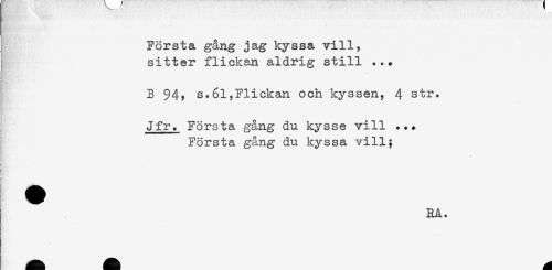 //// ) //// Första gång jag kyssa vill, //// sitter flickan aldrig still ... //// B 94? s.61,Flickan och kyssen, 4 str. //// Jfr. Första gång du kysse vill ... //// Första gång du kyssa vill; //// \ //// i //// i //// RA. ////