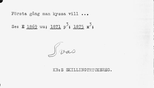 //// Första gång man kyssa vill ..* //// t //// Se: E 1869 uu; 1871 p^; 1875 x^; //// ! //// < //// t //// KB:S SKILLINGTRYCKSREG. //// ! //// t ////