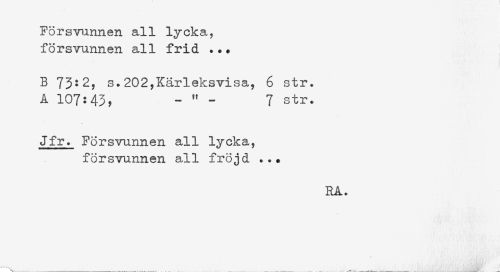 //// Försvunnen all lycka, //// försvunnen all frid ... //// B 73:2, s.202,Kärleksvisa, 6 str. //// A 107:43, - " - 7 str. //// Jfr. Försvunnen all lycka, //// försvunnen all fröjd ... //// RA. ////