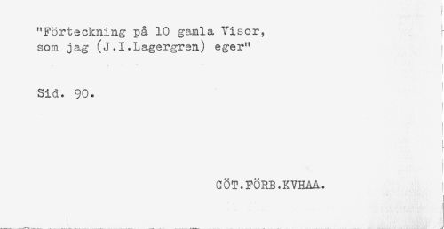 //// "Förteckning på 10 gamla Visor, ^ //// som jag (j.I.Lagergren) eger" //// , -. .. ' //// t //// Sid. 90. //// GÖT.FÖRB.KVHAA. ////