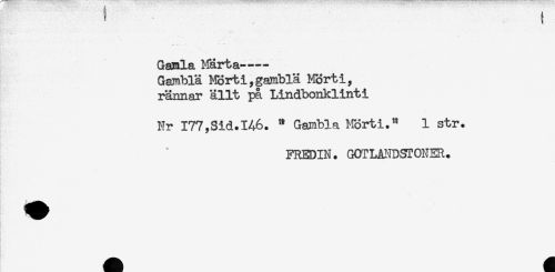 //// ' t //// Gamla Märta---- //// Gambia Mörti,gamblä Mört i, //// rännar ällt på Lindbonklinti //// Nr 177,Sid.146. " Gambia Mörti." 1 str. //// FREDIN. GOTLÄNOSTONER. ////