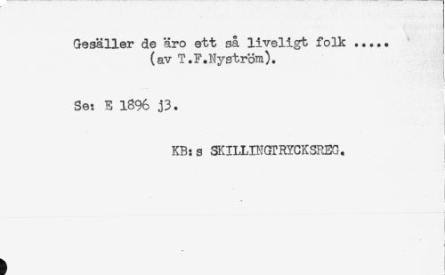 //// Gesäller de äro ett så liveligt folk ..... //// (av T.F.Nyström). //// i //// Se: E 1896 j3. //// ! //// KB:s SKILLINGTRYCKSREG. i //// j //// f //// _____._ _L--} //// < ////