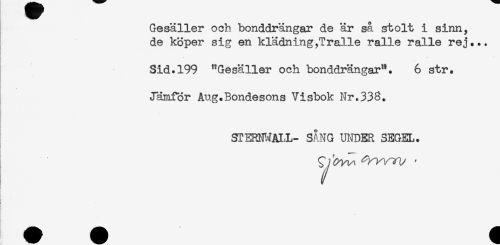 //// Gesäller och bonddrängar de är så stolt i sinn, //// de köper sig en klädning,Tralle ralle ralle rej... //// Sid.199 "Gesäller och bonddrängar". 6 str. //// Jämför Aug.Bondesons Visbok Nr.333. //// STERNNALL- SÅNG UNDER SEGEL. ////