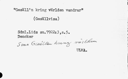 //// f //// "Gesäll'n kring världen vandrar" //// (Gesällvisa) //// Sdml.Lids sn.7922:3,s.5. } //// Dencker ! //// ULMA. ////