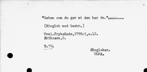 //// "Geten som du gav mi den har //// . //// (Ringlek med besky.) //// Vrml.Fryksände,2793:5,s.12. //// Eriksson,G. //// D.70. //// Sånglekar. //// ^ ULMA* //// f'. ////