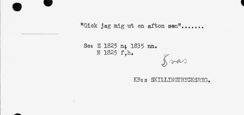 //// ^Gick jag mig ut en afton sen**....... //// jj * ' //// Se: E 1825 n; 1835 im. //// N 1825 f,h. ^ //// I J //// R //// KB:s SKILLINGTRYCKSREG. ////