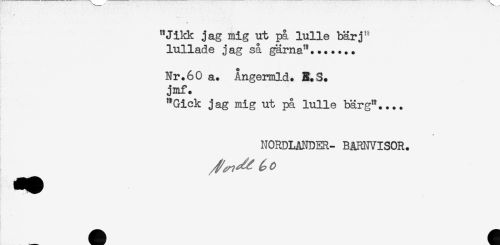 //// "Jikk jag mig ut på lulle bärj^ //// lullade jag så gärna"....... //// Nr.60 a. Angermld. E.S. //// jmf. //// "Gick jag mig ut på lulle bärg".... //// NORDLANDER- BARNVISOR. ////