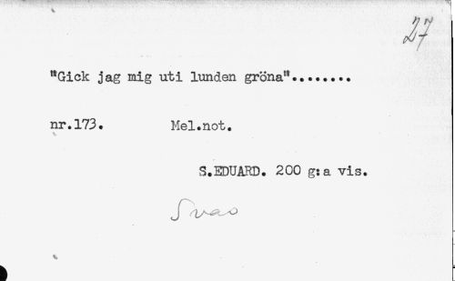 //// J //// /^Gick jag mig uti lunden gröna^... //// nr.173. Mel.not. //// 3.EDUARD. 200 g: a vis. ////