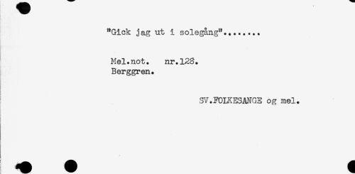 //// "Gick jag ut i solegång"... //// Mel.not. nr.128. //// Berggren. //// * //// SV.FOLKESANGE og mel. //// ; ////