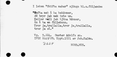 //// I leken "Skifta makar" sjöngs bl.a.följande: //// "Befta mek å ha bekommery //// dä bryr jak mek inte um. //// Heller vall jak tjäna bonner, //// An å ta en föllehnnn. //// Tror ja,trallalla,tror ja,trallallay //// tror ja så." //// p //// Vg. D.224. Gustav Adolfs sn. //// IFGH 24AC/29. Uppt.1931 av Joh.Kal&n. //// ^^^^ NORD.MUS. ////