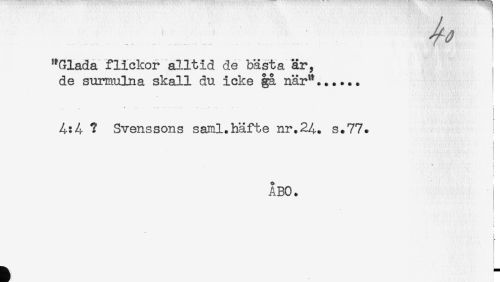 //// "Glada flickor alltid de bästa är, //// de surmulna skall du icke gå när"...... //// }- //// ? Svenssons saml.häfte nr.24. s.77. //// i //// i //// A BO. //// ! ////