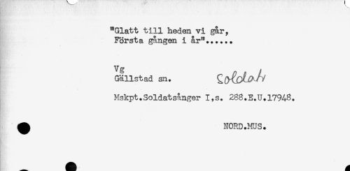 //// "Glatt till heden vi går, //// Första gången i år"...... //// Gäll st ad sn. SO^bL?-^ //// Mskpt.Soldatsånger I,s. 288.E.U.17948. //// ^ NORD.MUS. ////