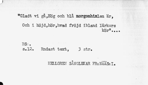 //// "Gladt vi gå,Hög och blå morgonhimlen är, //// Och i höjd,hör,hvad fröjd ibland lärkors //// kör".... //// BS,' . //// s.12. Rndast text, 3 str. //// KELLGREN SÅNGLEKAR FR: NMS: I. ////