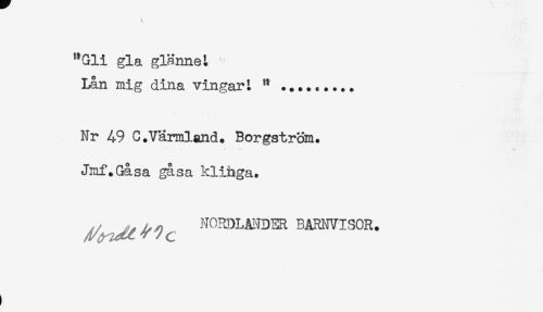 //// "Gli gla glännet ' //// Lån mig dina vingad //// Nr 49 C.Värmland. Borgström. //// Jmf.Gåsa gå sa klihga. //// ^^ N0RDLM3ER BARIWI30R. ////