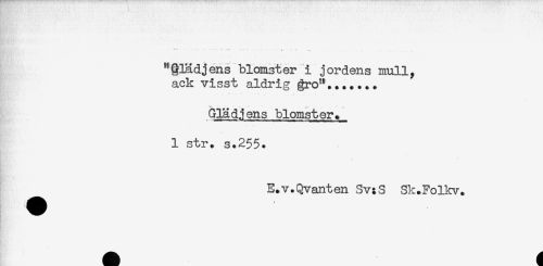 //// - .- ^ ^ . ^ .. - . . . _ .. //// ^gHdjens blomster i jordens mull, //// ack visst aldrig gro"....... //// Glädjens blomster. //// 1 str. s.255. //// E.v.Qvanten Sv;S Sk.Folkv. ////