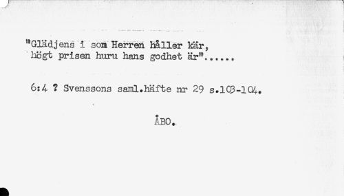 //// ! //// , -' - ' * , - ' ! //// ' ; . ' , \ ' ' ' ! //// * * - * * - - V-! t , //// "GBLdjens i som Herren haller kär, //// 'högt prisen huru hans godhet är"...... //// i //// t //// - //// 6:4 ? Svenssons saml.häfte nr 29 s.lCB-104. //// ÅBO. ////