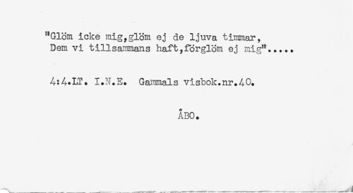 //// "Glöm icke mig,glöm ej de ljuva timmar, //// Dem vi tillsammans haft,förglöm ej mig"..... //// A:A.LT. I.N.E. Gammals visbok.nr.40. //// ÅBO. ////