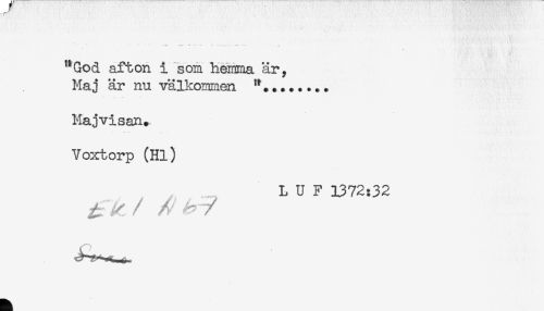 //// w - ' - .. < - - S //// "God afton i som hemma är. //// Haj är nu välkommen ... //// Majvisan. //// Voxtorp (Hl) //// L U F 1372:32 ////