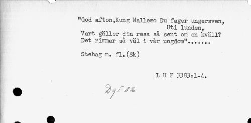 //// "God af ton,Kung Wallemo Du fager ungersven, //// Uti lunden, //// Vart gäller din resa så sent om en kväll? //// Det rimmar så väl i vår ungdom"....... //// Stehag m. fl.(Sk) //// L U F 3383:1-4. //// * ////