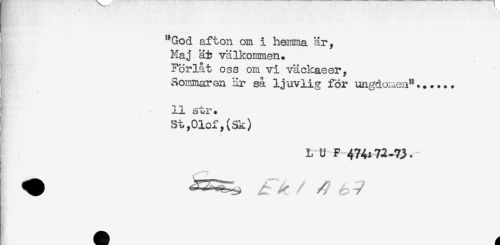 //// j "God afton om i hemma är, //// * Maj ät välkommen. //// ] Förlåt oss om vi väckaeer, //// ] Sommaren är så ljuvlig for ungdomen"...... //// ) 11 str. //// I: St,Olof, (Sk) //// L U F 474*72-73.- ////
