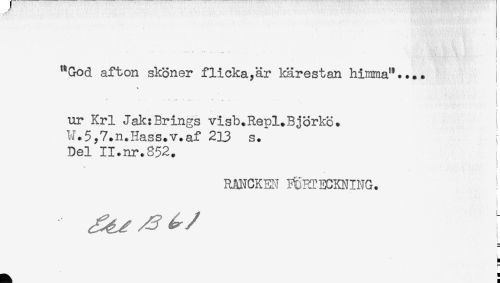 //// : //// **God afton sköner flicka,är kärestan hiimaa".... I //// T //// < //// ur Krl Jak:Brings visb.Repl.Björkö. //// *. .5,7.n.Hass.v.af 213 s. ; //// Del II.nr.852. //// *. i //// RANCKEN BETECKNING. ' //// < ////