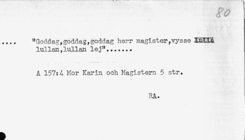 //// .... "Goddag,goddag,goddag herr magister,vysse 3M3X. //// lullan,lullan lej"....... //// , . .. -- .4 r - < . ... //// A 157:4 Mor Karin och Magistern 5 str. //// HA. //// * [ ////
