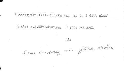 //// ) //// f //// "Goddag min lilla flicka vad har du i ditt sinn" ! //// ! //// B 4-6:1 s.4.Kärleksvisa. 8 str. kom.mel. //// RA. //// ^ i ^^ ////