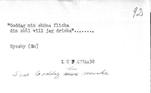 //// "Goddag min sköna flicka //// din skål vill jag dricka"... //// Ryssby (Sm) //// L U B 4774:38 ////