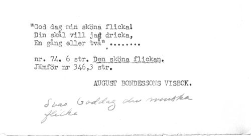 //// "God dag min sköna flickat //// Din skål vill jag dricka. //// En gång eller två" ... //// * - //// nr. 74. 6 str. I^n sköna flickan. //// Jämför nr 34-6,3 str. //// AUGUST BONDESSONS VISBOK. ////