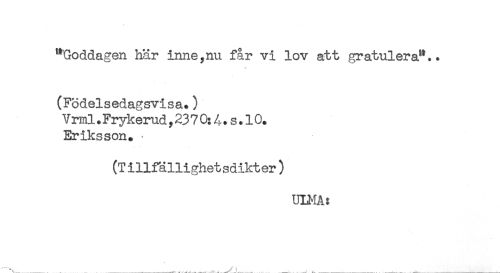 //// "Goddagen här inne,nu får vi lov att gratulera".. //// * //// (Födelsedagsvisa.) //// Vrml. Frykerud, 23 7 0: . s. 10. //// Eriksson. //// (T illfallighet sdikter) //// ULMA: ////