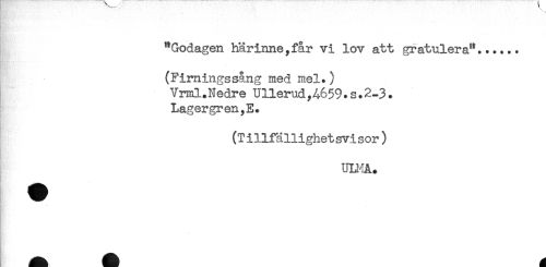 //// "Godagen härinne,får vi lov att gratulera"...... //// (Fimingssång med mel.) //// Vrml.Nedre Ullerud,4659.s.2-3. //// Lagergren,E. //// (Tillfällighetsvisor) //// ULMA. ////