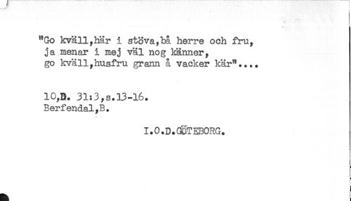 //// "Go kväll,här i stöva^tå herre och fru, //// ja menar i mej väl nog känner, //// go kväll,husfru grann å vacker kär".... //// 10,B. 31:3,s.13-16. //// Berfendal,B. //// * //// I.0.D.G&TEB0RG. ////