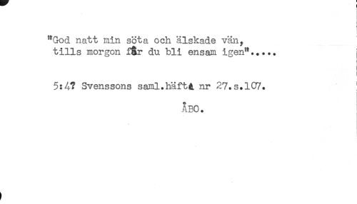 //// ) //// "God natt min söta och älskade vän, //// tills morgon f&r du bli ensam igen"..... j //// 5:4? Svenssons saml.häftA nr 27.s.107. ! //// t //// ÅBO. //// ) ////