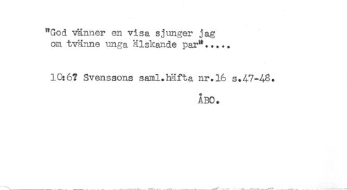 //// "God vänner en visa sjunger jag //// om tvänne unga älskande par"..... //// 10:6? Svenssons saml.häfta nr.16 s.47-48. //// ABC. ////