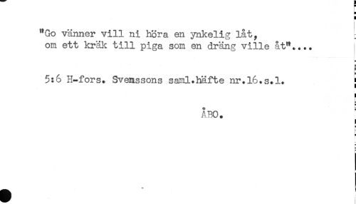 //// H //// H //// "Go vänner vill ni höra en ynkelig låt, : //// om ett kräl^ till piga som en dräng ville åt".... i //// * //// 5 //// 5:6 H-fors. Svenssons saml.häfte nr.l6.s.l. } //// t //// ÅBO. //// ! //// a //// j //// e //// r ////
