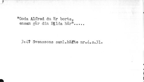 //// "Goda Alfred du är borta, //// ensam gar din Hilda här"..... //// 3:4? Svenssons saml.häfte nr.4.s.31. //// < //// t //// t //// H //// E //// < ////