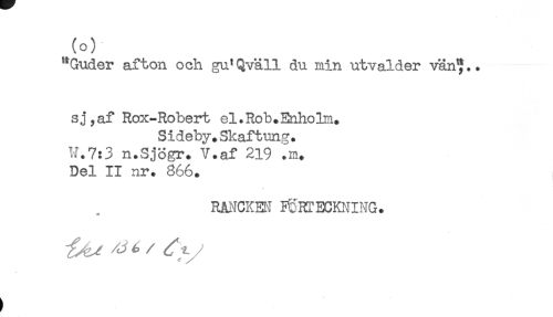 //// (o) //// "Guder afton och gu^Qväll du min utvalder vän^.. //// sjyaf Rox-Robert el.Rob.Enholm. //// Sideby.Skaftnng. //// W.7:3 n.Sjögr. V.af 219 *m. //// Del II nr. 866. //// RANCKEN FtRTECmilNG. ////