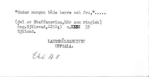 //// t //// "Guder morgon både herre och fru,"..... //// (del av Staffansvisa,här som ringlek) //// Ång.Själevad,2252;3 s.XXXX 33 //// Sjölund. //// LANDSMALSAHKIVEr //// UPPSALA. //// ! ////