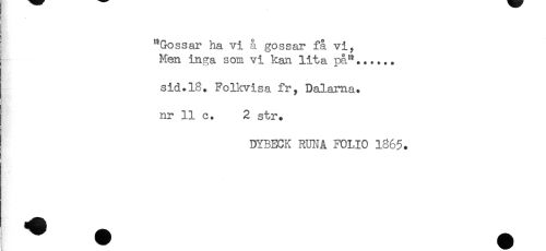 //// "Gossar ha vi å gossar få vi. //// Men inga som vi kan lita på"...... //// sid.18. Folkvisa fr, Dalarna, //// nr 11 c. 2 str. //// DYBECK RUNA FOLIO 1865. ////