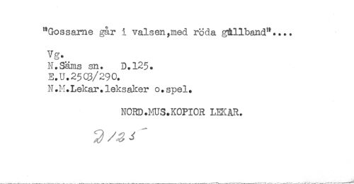//// "Gossame går i valsen,med röda g&llband".... //// Vg. //// N.Säms sn. D.125. //// E.U.25Q3/29C. //// N .M.Lekar. leksaJ^er o.spel. //// NORD.MUS.KOPIOR LEKAR. ////