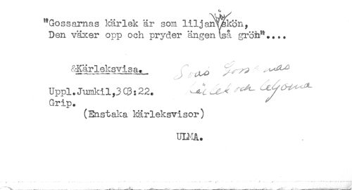 //// "Gossarnas kärlek är som liljanLekön, //// Den växer opp och pryder ängen (så gröh".... //// &Kärleksvisa. ' . //// Uppl.Jumkil,3C3:22. ^ ^ ^ //// Grip. ^ //// (Enstaka l&rleksvisor) //// UD-IA. //// ^ , .. .*. . ... . ^ , . . .. ,-;*... ... . .- .i,.... , ,..- t . ..i* * < .. < i. J) . - *.......^'.-..-^t. - - ^--.-..-f ////