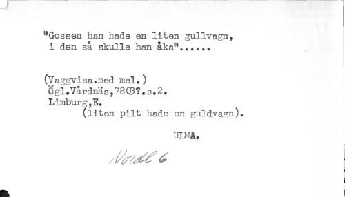 //// "Gossen han hade en liten gullvagn, //// i den så skulle han åka"...... //// ) //// ? //// * //// (Vagsyisa.med mél.) //// Ogl. Vårdnäs ^ 75 03?. s. 2. ^ //// LimburgyE. //// (liten pilt hade en guldvagn). //// ULMA. //// t //// ^ //// a //// i ////
