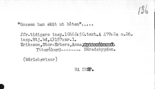 //// "Gossen han skot ut båten"..... //// Jfr.tidigare insp.l0660:50.text.A 479:2a o.26. //// insp.Rtj.bdy43157:nr.l. //// Eriksson,Stor-Erkers ,Anna^^ //// Ytteråkerö----- Häradsbygden. //// (kärleksvisor) //// RA INSP. //// i //// t //// * ////