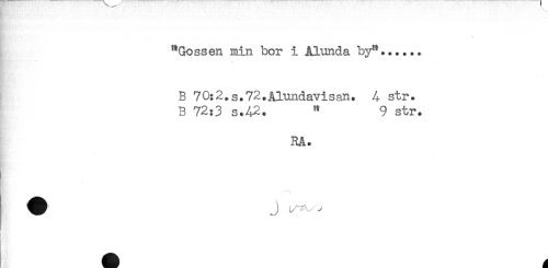 //// "Gossen min bor i Ålunda by"...... //// B 70:2.s.72.Ålundavisan. 4 str. //// B 72:3 s.42. " 9 str. //// Rå. //// J -^ ////