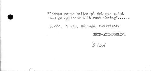 //// ^^ "Gossen satte hatten på det nya modet //// I med guldgaloner allt runt ikring"...... //// s.222. 7 str. Bälinge. Dansvisor. //// GRIP-ÅLniOGELIV. //// -.../ U....,... ......_ //// /