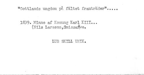 //// "Gottlands ungdom på fältet framträder"..... //// 1839. Minne af Konung Karl XIII... //// (Nils LarssonySmissar^e. //// LUB SKILL UNIK. //// * ////